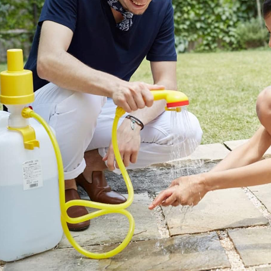 市販のポリタンクにセットするだけ!本体上部のポンプを押すと空気圧でシャワーが出るので、手洗いや砂落としなどに重宝するのがこちらです。