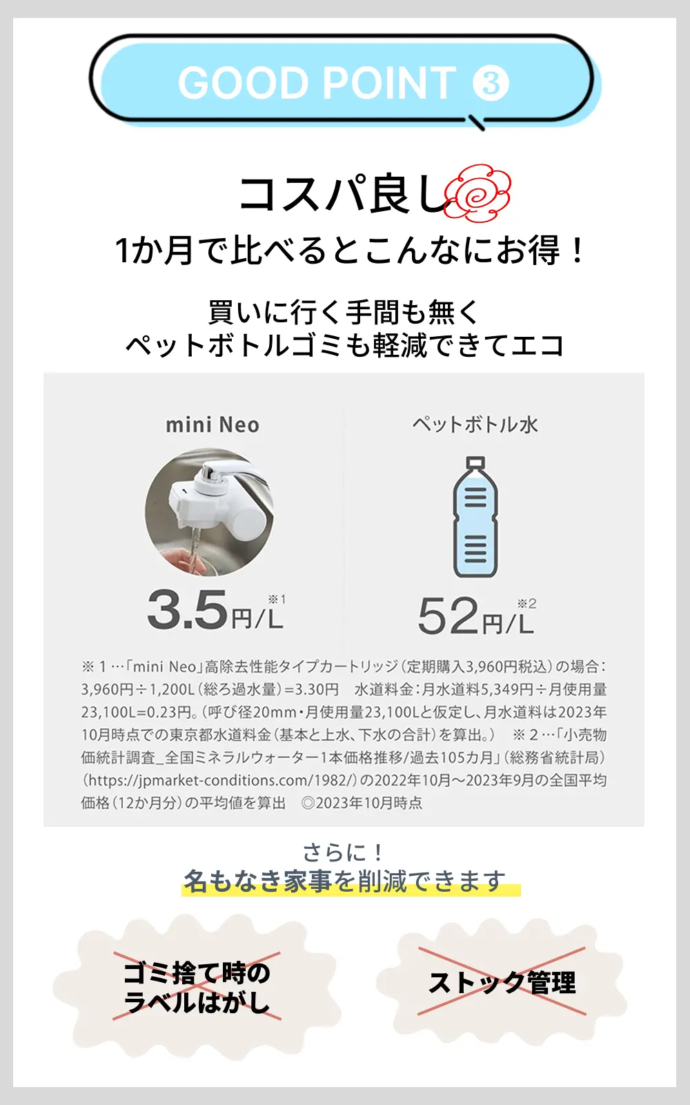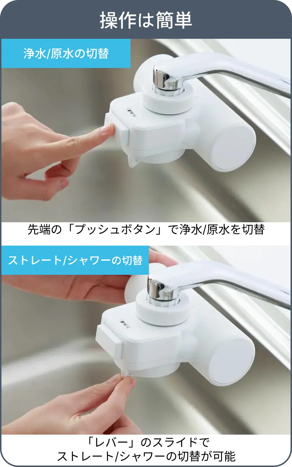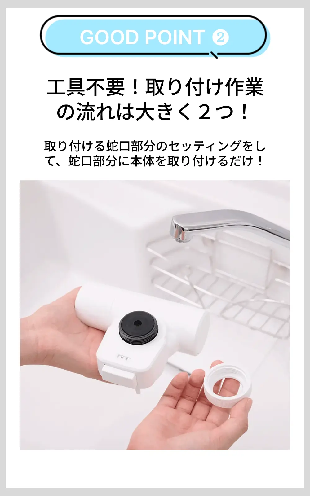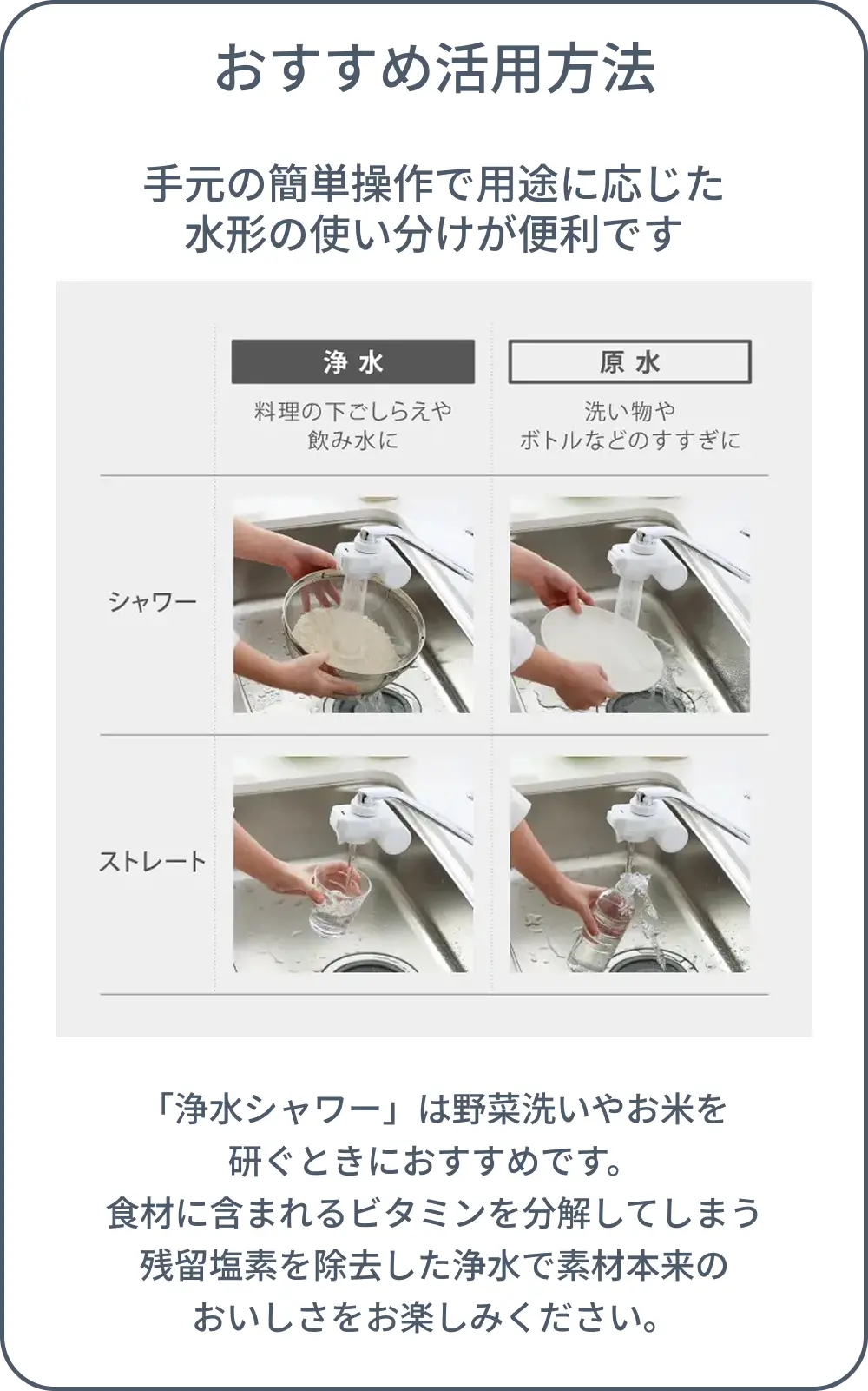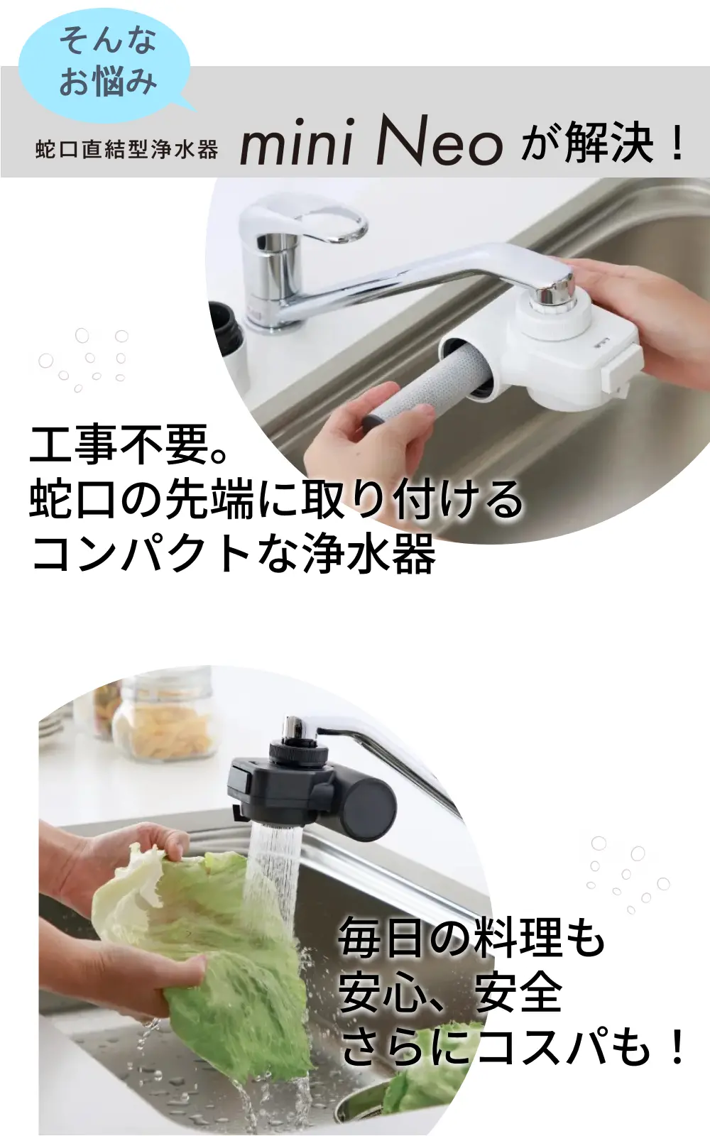 | 商品説明 | 手軽においしい水が楽しめる「蛇口直結型」の浄水器です。明るい配色のキッチンに馴染むホワイトボディのミニマルデザインです。水道水中のミネラルはそのままに残留塩素や不純物を除去します。飲み水はもちろん、料理の下ごしらえからお茶やコーヒーをいれるなど、さまざまな用途で活躍します。 高除去性能タイプの浄水カートリッジが1本付いています。 浄水カートリッジは手元で簡単に交換できます。クリーンな状態を保つための抗菌セラミックで毎日の捨て水は不要です。 ※2日以上使用しなかった場合は20秒以上「浄水」を流してからご使用ください。浄水カートリッジは消耗品です。毎日おいしい水をご利用いただくには、定期的な浄水カートリッジの交換が必要です。 |