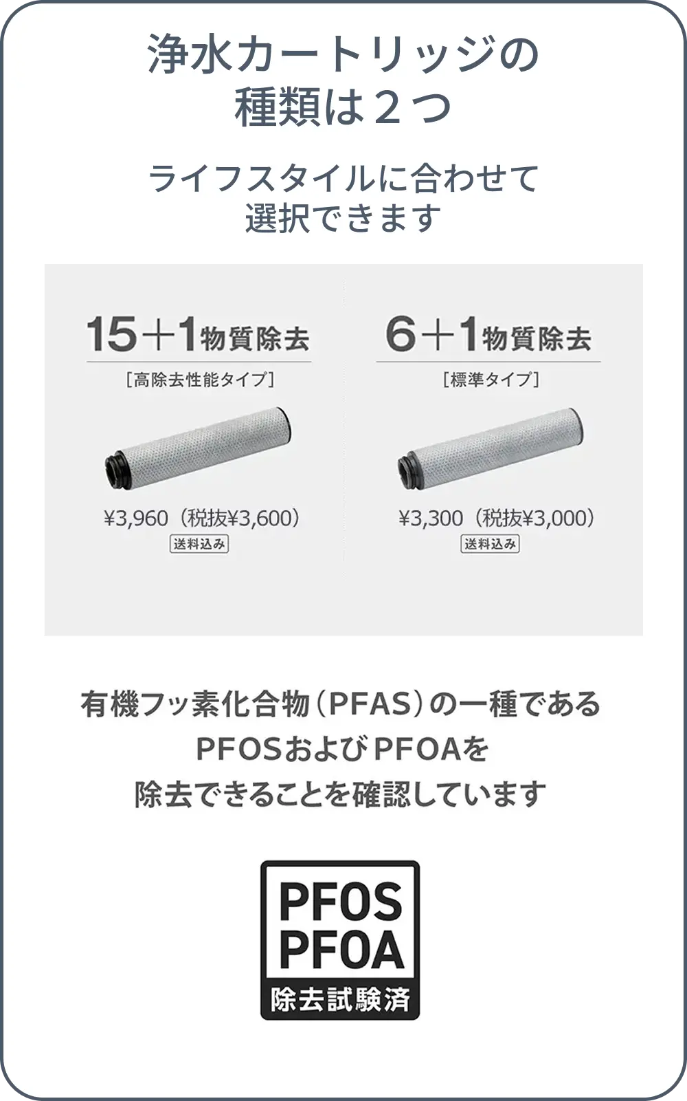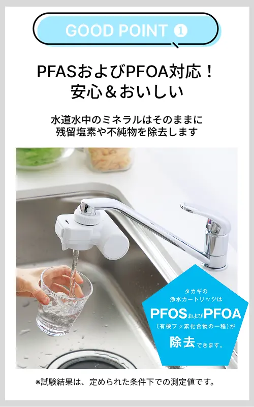 有機フッ素化合物(PFAS)の一種であるPFOSおよびPFOAの除去につきましては、浄水器協会(JWPA)が定める規格基準(JWPAS B基準)で規定された試験方法による試験を実施し、PFOSおよびPFOAを除去できることを第三者試験機関にて確認しております。