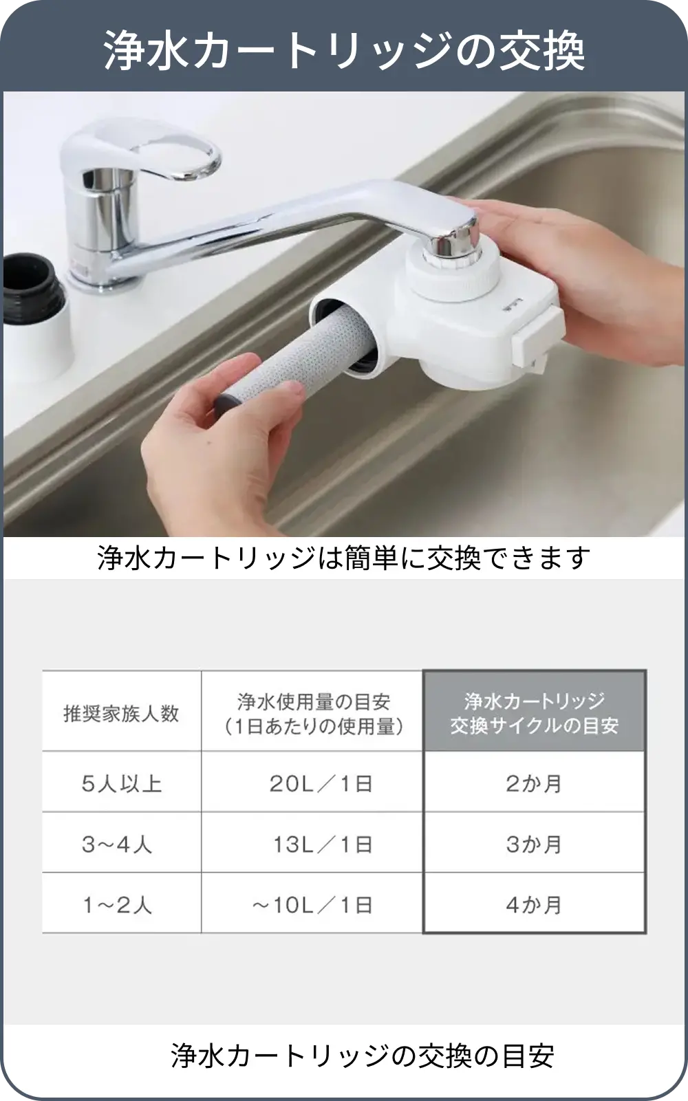 | 使い方 | [交換サイクル目安] ・5人以上のご家族:2か月サイクル(1日あたり使用量20L) ・3~4人家族:3か月サイクル(1日あたり使用量13L) ・1~2人家族:4か月サイクル(1日あたり使用量~10L) ※浄水カートリッジの交換サイクルの目安や浄水使用量、水圧、水質(にごり、赤サビ、その他)などや、給水整備、配管の汚れ、老朽化や工事によって大幅に低下する場合があります。 ※カートリッジは通水後、徐々に性能が低下し規定の浄水能力を下回る可能性があります。においや目詰まりを防ぎ安心してお使いいただくために4か月サイクルを最長としています。 |